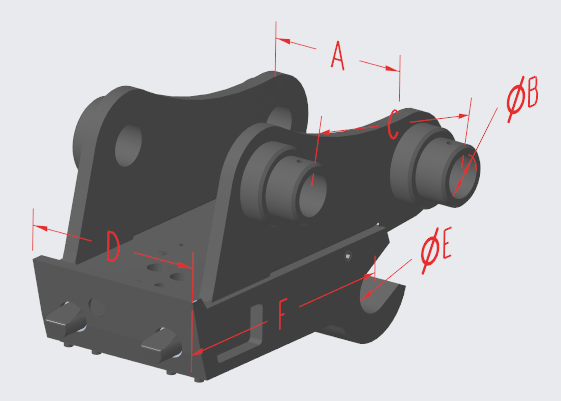 Model A(installation width - mm) B(axis diameter - mm) C(axis distance - mm) D(total width - mm) E(axis diameter - mm) F(axis distance - mm) Oil pressure - Mpa Total weight - Kg Suitable excavator - Ton HS03 Customized according to customer needs 198 50 / 3-20Mpa 50 1.5-5 HS08 Customized according to customer needs 290 60 / 3-20Mpa 98 6-12